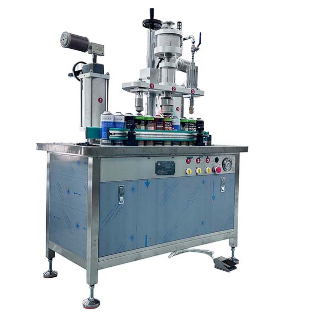 It can be used for filling various media and producing different aerosol chemical products. Professional technical design saves both labor and time. The filling head is independently controlled and non - mechanical, and the inflatable head is precisely guided, which is highly efficient and has low air consumption. It is widely used in experimental household production and chemical laboratory equipment, such as aerosol products in the fields of food, medicine, hygiene, automobiles, environmental protection, fire fighting, and daily necessities.